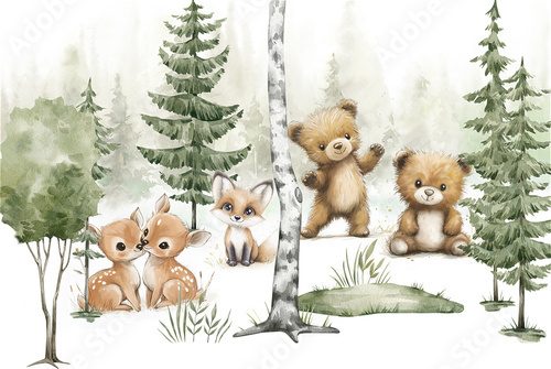 Fototapeta: Cute animals in the forest. Illustration for wallpaper, decoration, poster.