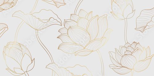 Fototapeta: Gold lotus line pattern. Golden design with lotus flower and leaves on white background. Vector illustration.