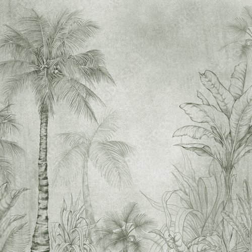 Fototapeta: Hand-drawn tropical palm trees and foliage in a pencil sketch style. Botanical jungle illustration with vintage and natural aesthetic, ideal for prints, posters, and interior decor.