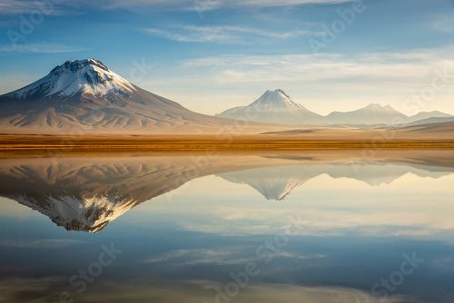 Fototapeta: Idyllic Lake Lejia reflection and volcanic landscape in Atacama desert, Chile