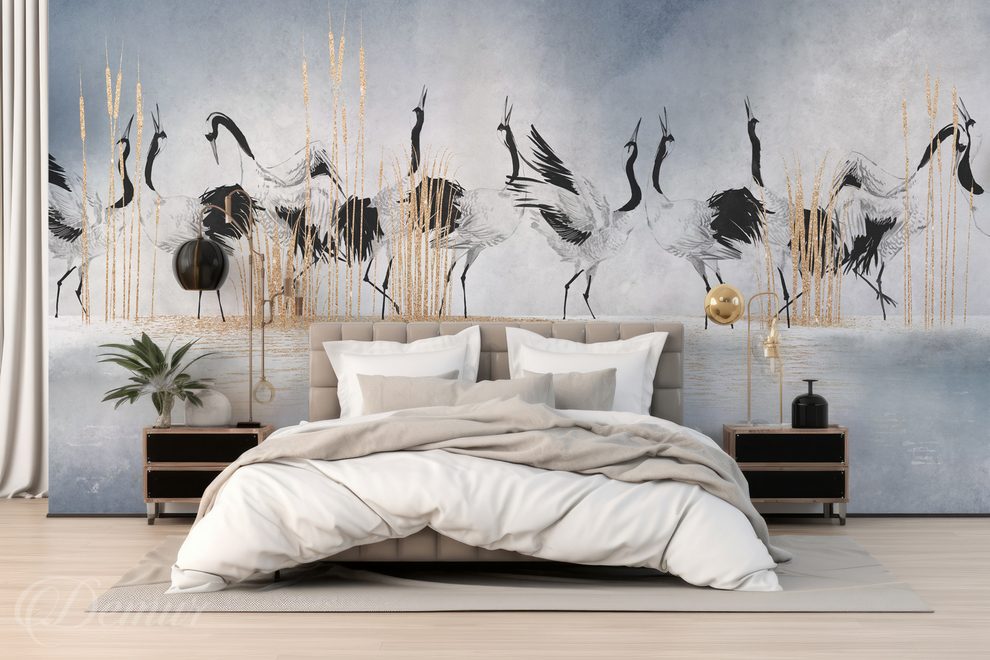 Dynamická a zároveň harmonická kompozice, ve které jeřábi jakoby tančí v jemné mlze. Fototapeta odráží jemnost přírody, kombinuje minimalistickou estetiku s nápadným kontrastem černé a šedé. Akcenty připomínající zlaté trávy dodávají hloubku a lehkost a vytvářejí atmosféru klidu a sofistikovanosti. Ideální do ložnice nebo obývacího pokoje, kde chcete vytvořit prostor plný lehkosti, elegance a přirozeného rytmu.