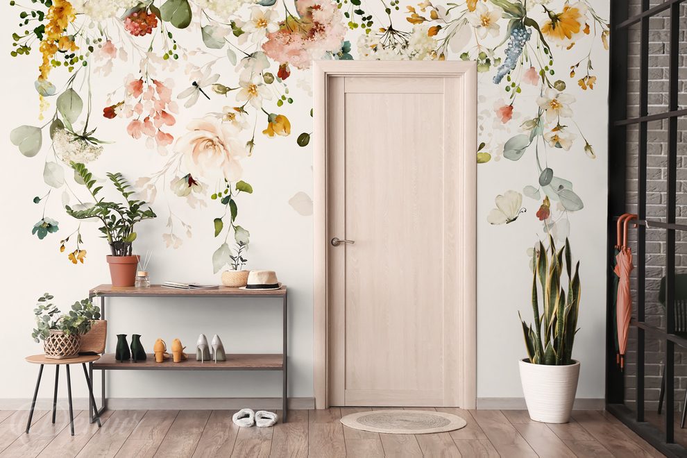 Jemné akvarelové květiny padají jako světelná opona a vytvářejí atmosféru jemné elegance. Fototapeta vnáší do interiéru závan přírody a lehkosti, pastelové odstíny v kombinaci s přírodními barvami zase harmonii. Motiv inspirovaný rozkvetlou zahradou dělá prostor svěží a romantický. Skvěle se hodí do předsíně, ložnice nebo obývacího pokoje, kde vytváří efekt jemné organické dekorace, která podtrhuje přirozenou krásu okolí.